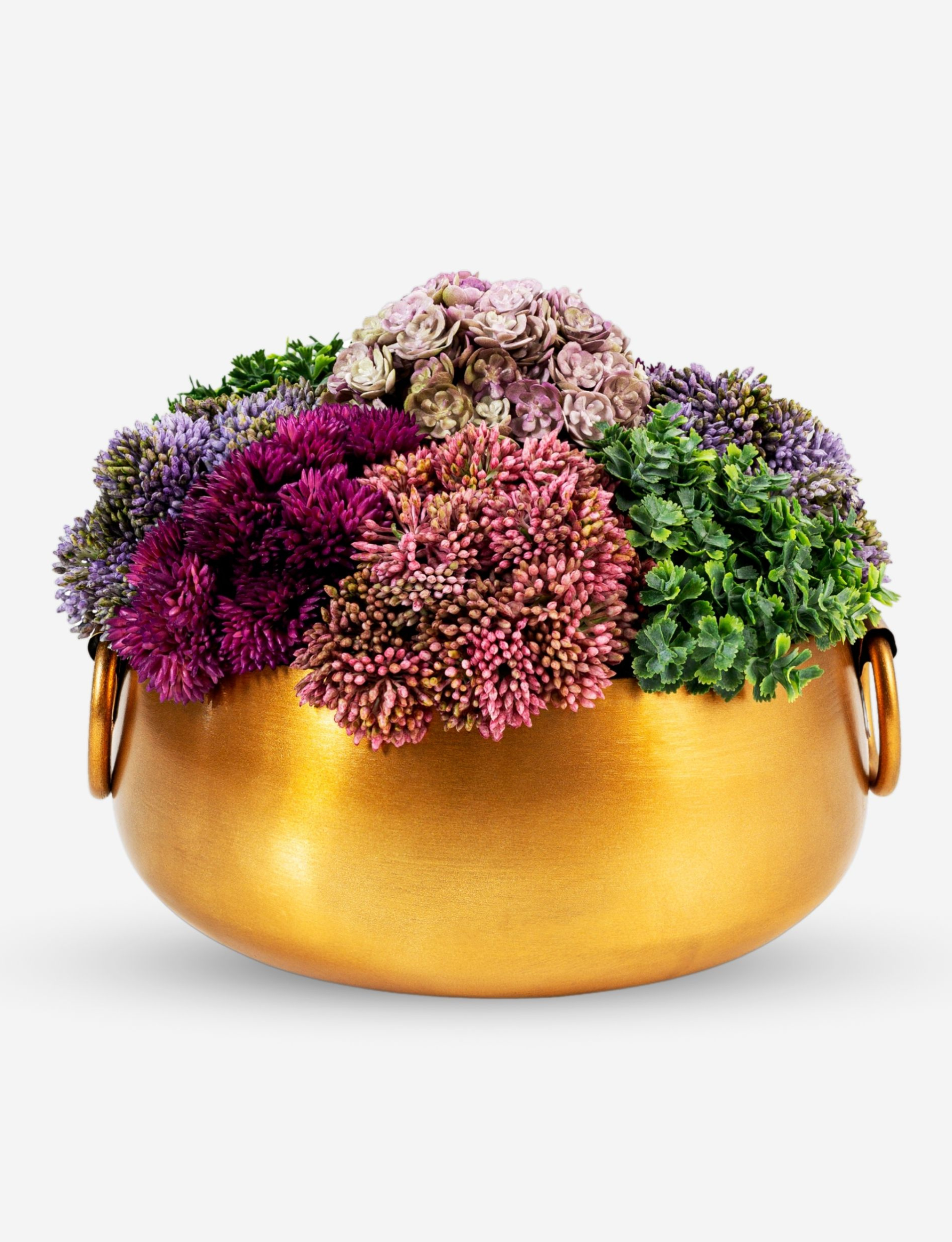 The Alba Gold Sedum Arrangement: a vibrant multicolor faux sedum arrangement displayed in a stunning gold vase. Whether gracing your tabletop as a centerpiece, brightening up a space as a colorful accent or offered as a thoughtful gift, it brings joy and elegance to any setting.