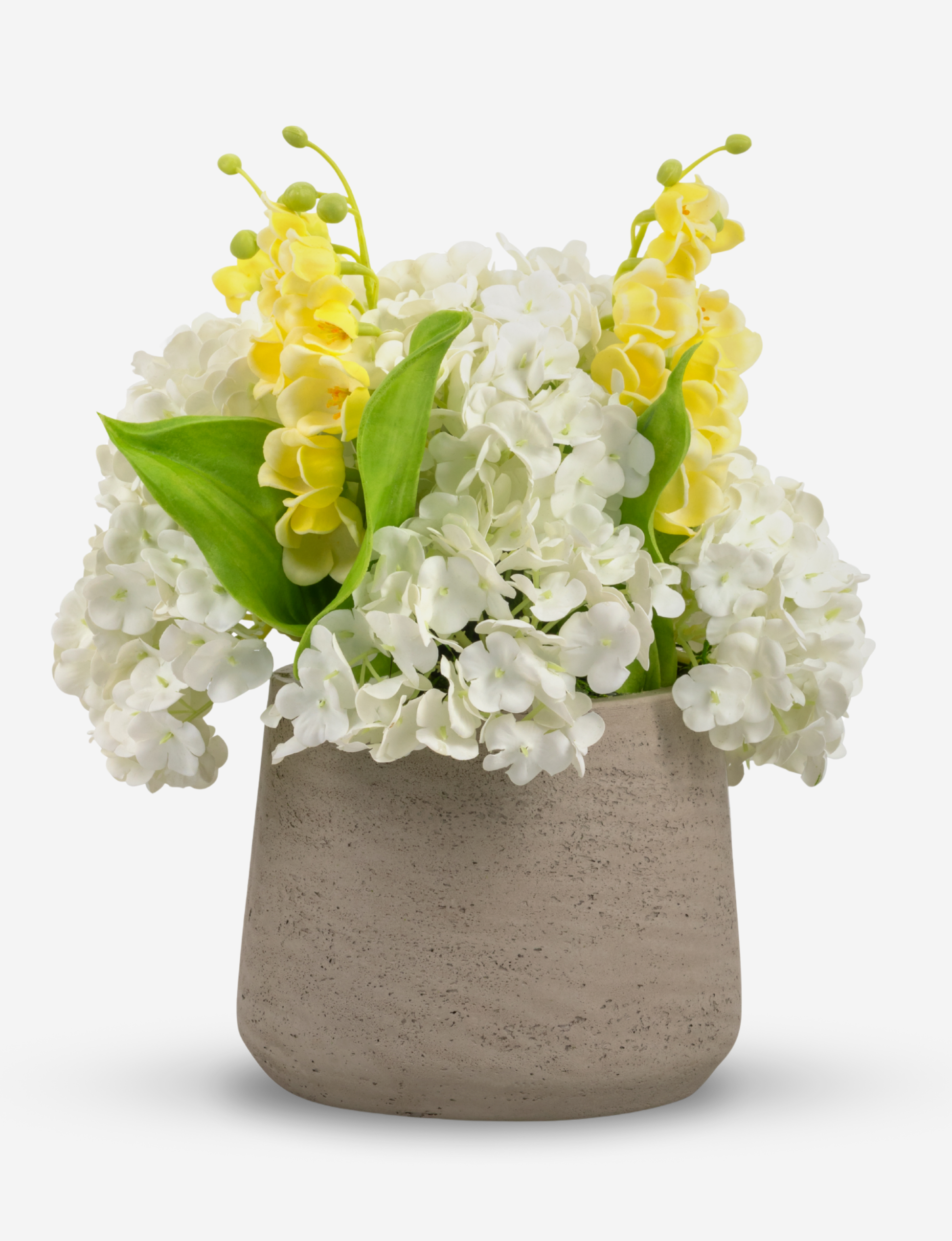 The Carina RealTouch Mixed Floral Arrangement blends crisp white hydrangea with soft yellow floral accents, creating a fresh and beautifully balanced composition. Lush greenery adds movement and contrast, while the sculptural cement vessel grounds the arrangement with a refined, modern feel. Crafted with CocoBella’s signature RealTouch materials, Carina brings a subtle pop of color and makes a versatile accent for kitchens, consoles, and intimate interior spaces.