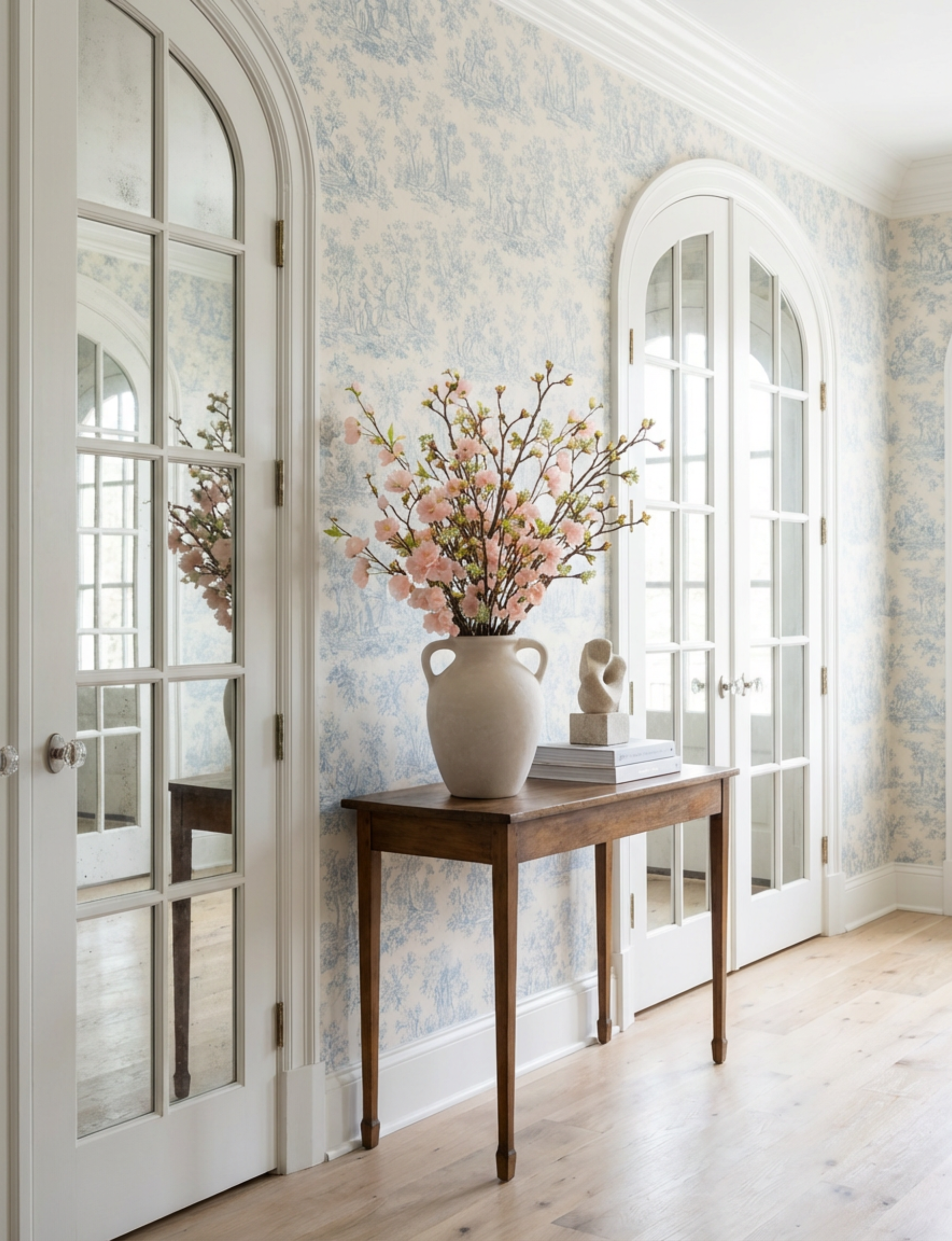 The Thiery Handled Cherry Blossom Arrangement features graceful cherry blossom branches in soft blush tones, arranged with natural height, movement, and an airy, sculptural presence. Set in a paper mache hand-finished vessel with elegant side handles, this piece blends classic form with romantic floral detail, creating a beautifully collected look. Thoughtfully composed to anchor entryways, consoles, and larger interior spaces, Thiery is a true wow piece and a great addition to any space, bringing timeless charm and refined beauty into the home.