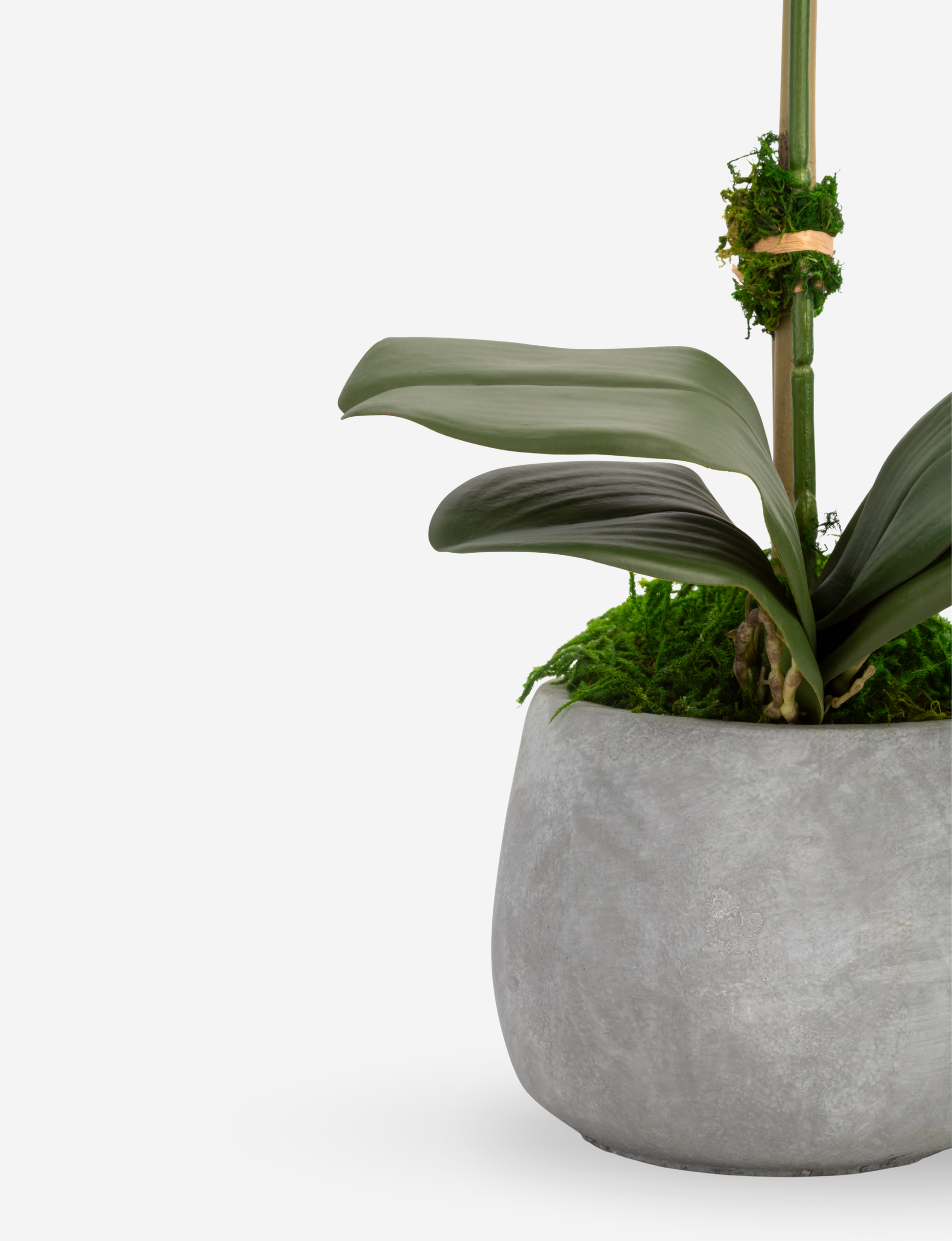 The Wesley RealTouch Cement Orchid Arrangement features beautiful petite RealTouch Orchids, gracefully resting in a gorgeous cement vase with gentle curves, complemented by an elegant Orchid leaf and bamboo stick. A perfect embodiment of sophistication, this refined piece makes an exceptional gift or a stunning addition to any space. A lasting luxury, timeless and unrivaled.