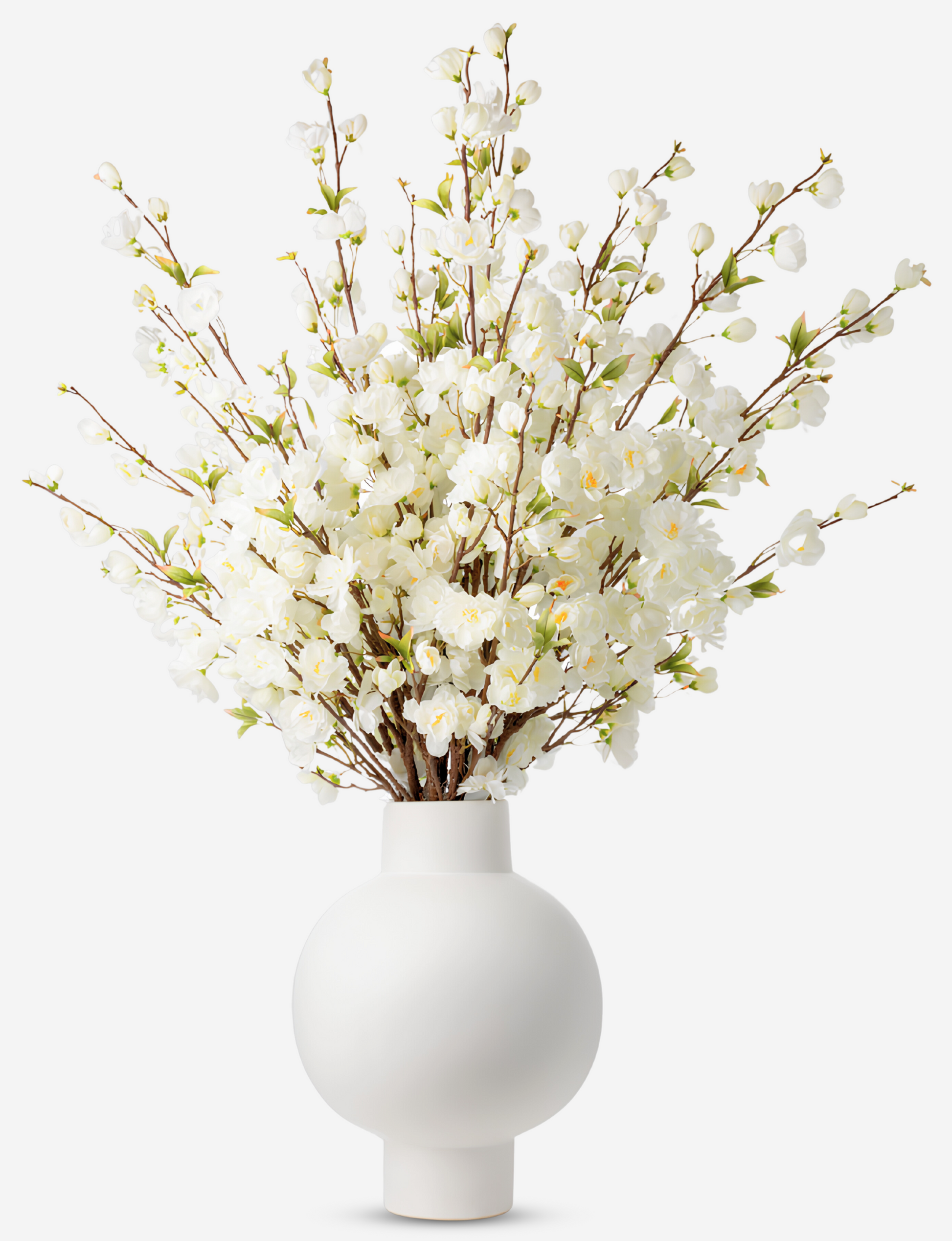 The Lex Cherry Blossom arrangement: a breathtaking showcase of lush white cherry blossoms in a designer curved vase, captivating attention with its sheer beauty. This large, showstopping arrangement is the perfect centerpiece to elevate any space with elegance and charm. These Cherry Blossoms are the perfect wow factor to dress up your foyer, console table and any special space.