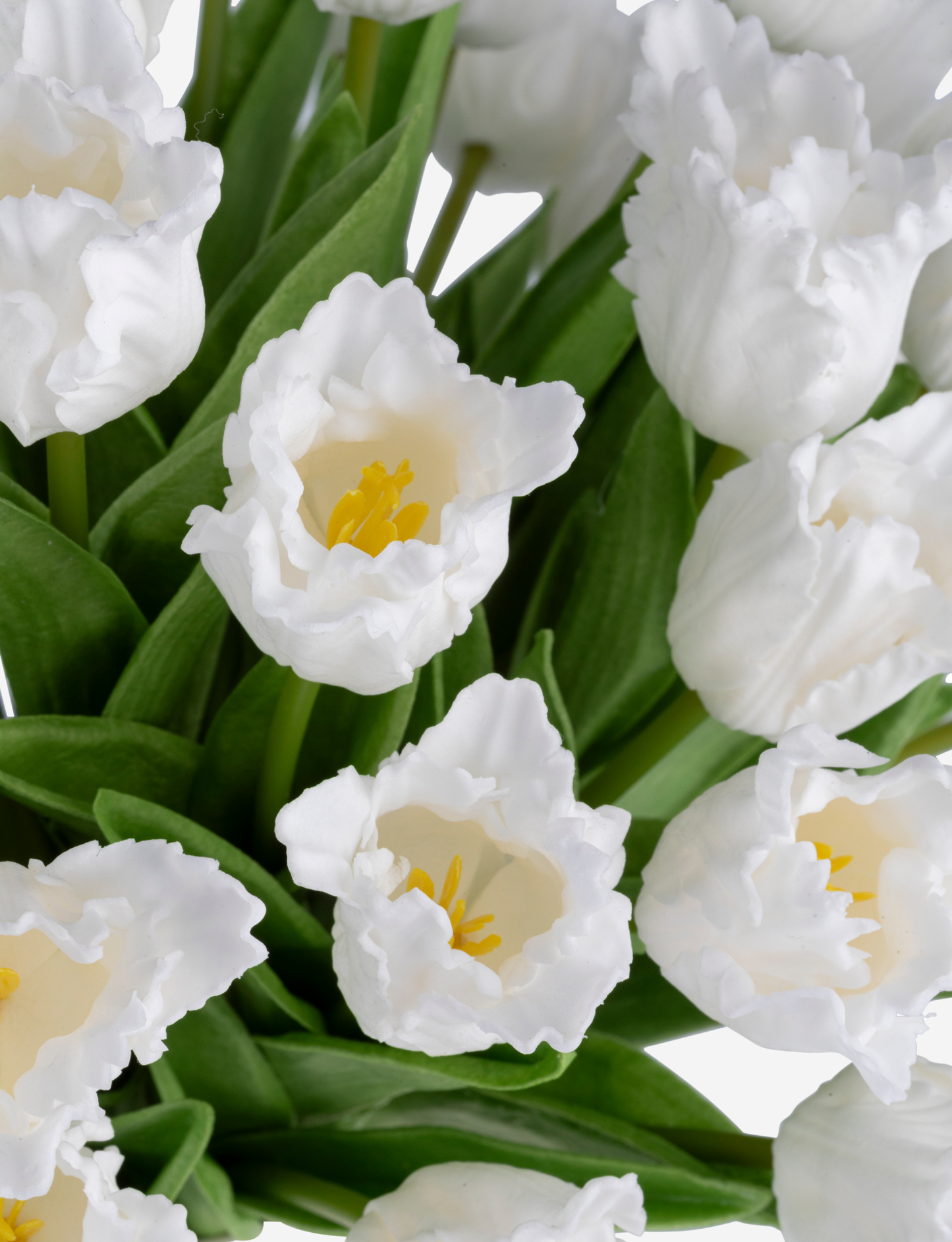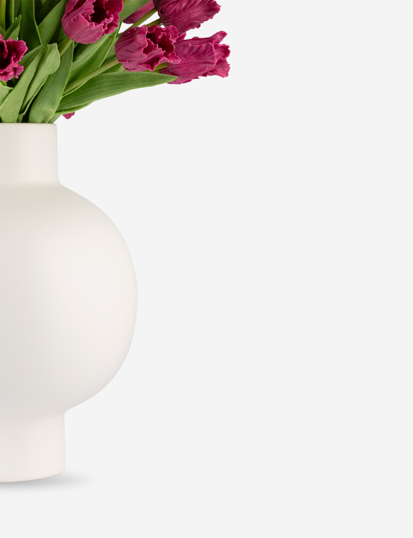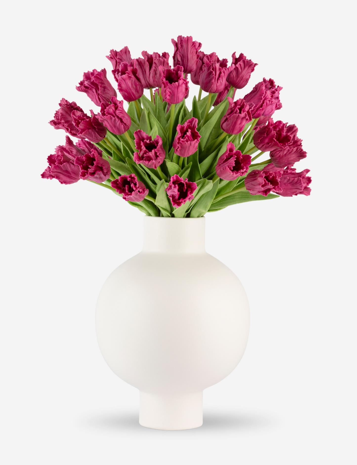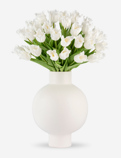 The Zélie RealTouch Tulip Arrangement features a sculptural white vase with a rounded body, subtle pedestal base, and a narrow raised lip that adds a refined finishing touch. Filled with 48 soft-to-the-touch RealTouch parrot tulips, each bloom is beautifully lifelike and artfully arranged. Striking yet understated, Zélie brings effortless elegance to any space—whether as a centerpiece, an accent, or a gift that leaves a lasting impression.