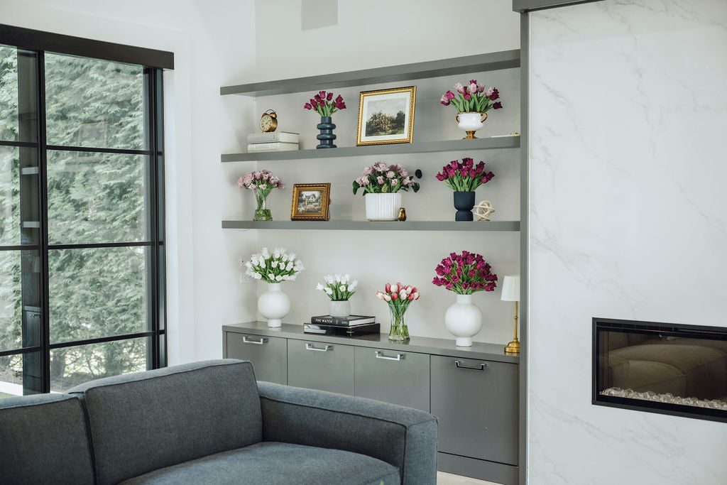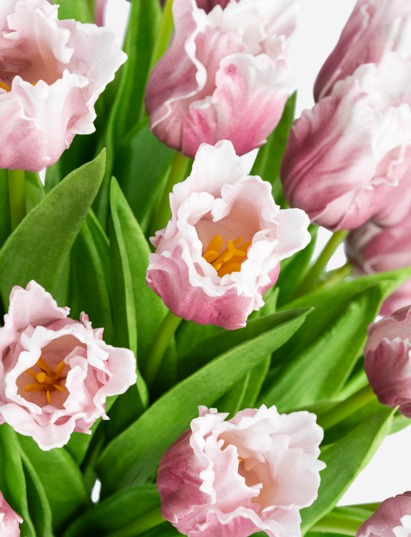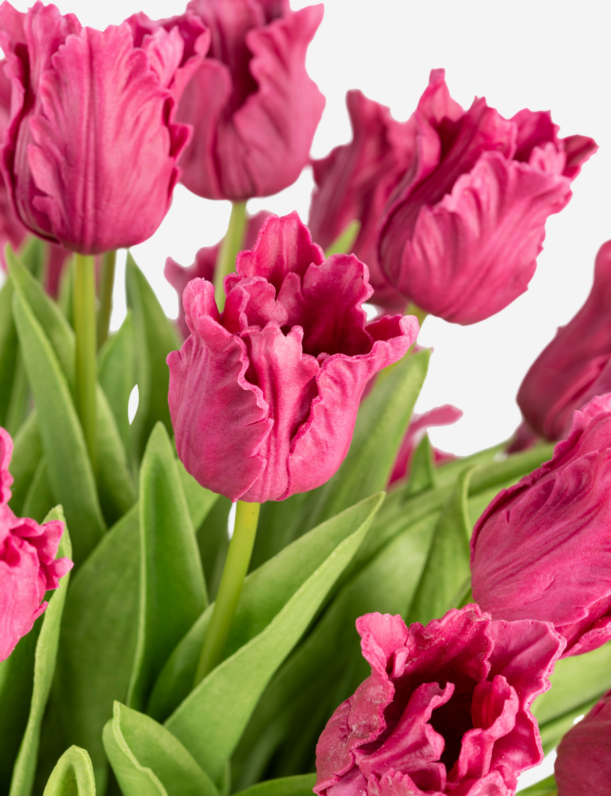 The Zélie RealTouch Tulip Arrangement features a sculptural white vase with a rounded body, subtle pedestal base, and a narrow raised lip that adds a refined finishing touch. Filled with 48 soft-to-the-touch RealTouch parrot tulips, each bloom is beautifully lifelike and artfully arranged. Striking yet understated, Zélie brings effortless elegance to any space—whether as a centerpiece, an accent, or a gift that leaves a lasting impression.